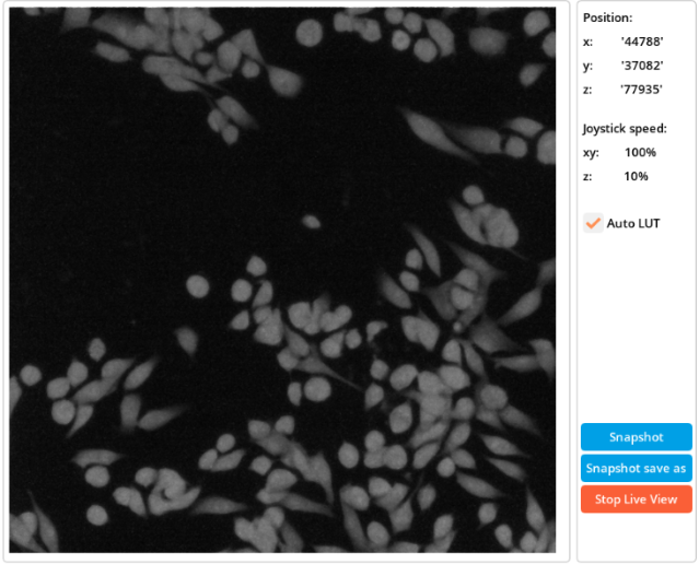 The Live Preview is an option within the image acquisition window that, when selected, displays in real-time what the microscope objective is seeing. This feature allows users to observe immediate feedback while making manual adjustments such as changing LED channels or adjusting stage movement. The ability to see in real-time what is being displayed on the screen enables users to confirm they are capturing exactly what they desire and helps them make precise adjustments for optimal results. It’s an invaluable tool for ensuring the quality and accuracy of the acquired images. When the live is on, the “Start live view” button will become the “Stop live view” button.